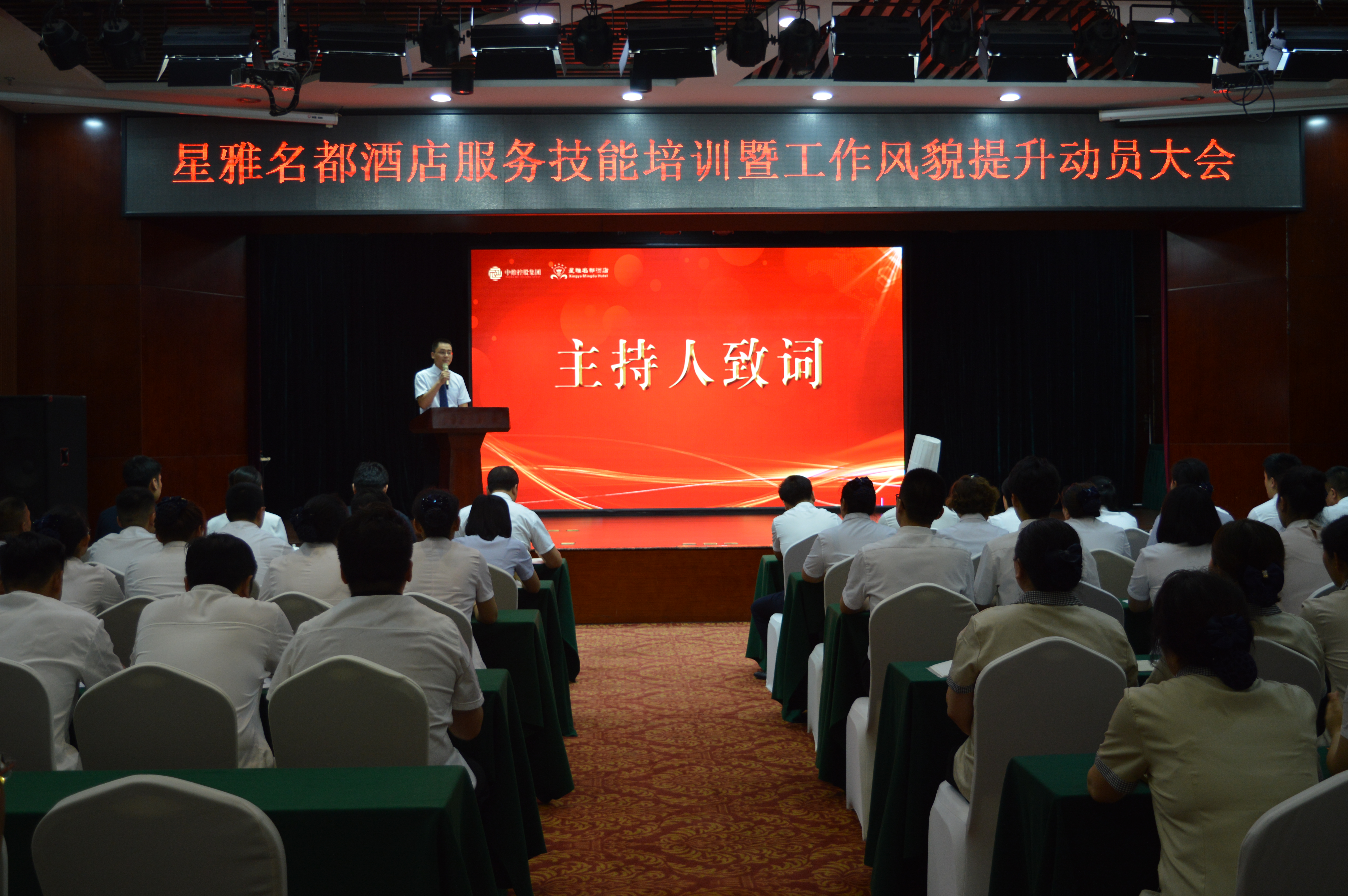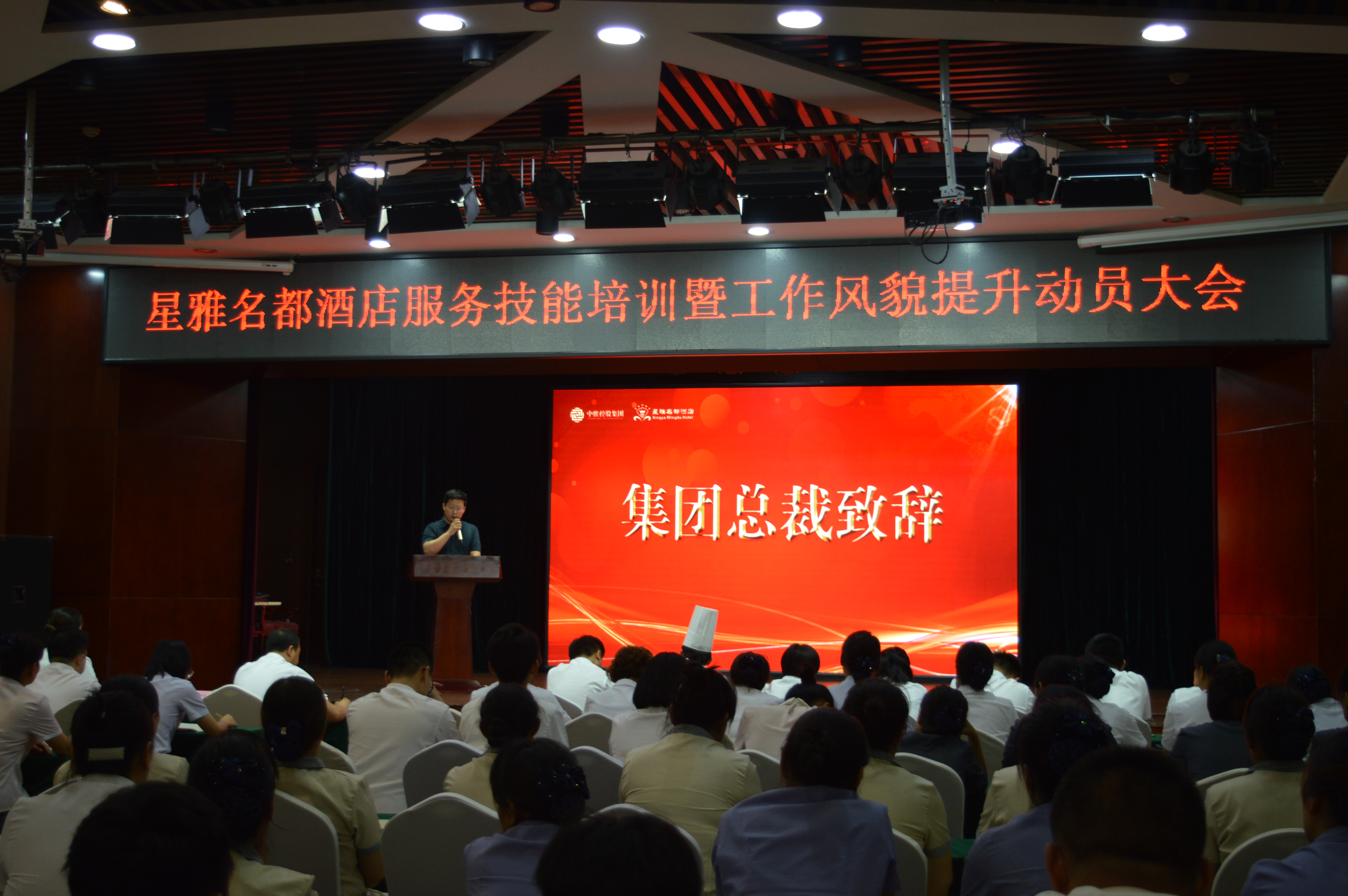 集團(tuán)總裁郭雅磊向大會致辭,郭總對酒店服務(wù)品質(zhì)提升及培訓(xùn)工作的開展提出兩點(diǎn)部署:首先,要統(tǒng)一思想,提高認(rèn)識,進(jìn)一步增強(qiáng)責(zé)任感和使命感;其次,務(wù)必精心組織,強(qiáng)化措施,全力抓好服務(wù)技能培訓(xùn)落實(shí)。酒店自今日起,要掀起一場轟轟烈烈的以“強(qiáng)化管理、提升服務(wù)”為主題的大培訓(xùn)、大學(xué)習(xí)活動,通過培訓(xùn)活動使大家的工作及精神面貌有明顯改觀、服務(wù)質(zhì)量及員工整體素質(zhì)強(qiáng)化提升、管理機(jī)制得到進(jìn)一步加強(qiáng)與完善。最后,郭總向酒店全員發(fā)出號召,希望全體星雅人攜起手來,臥薪嘗膽刻苦鉆研、勠力同心共克時艱,重塑星雅酒店輝煌,共同開拓星雅酒店更加美好的明天!