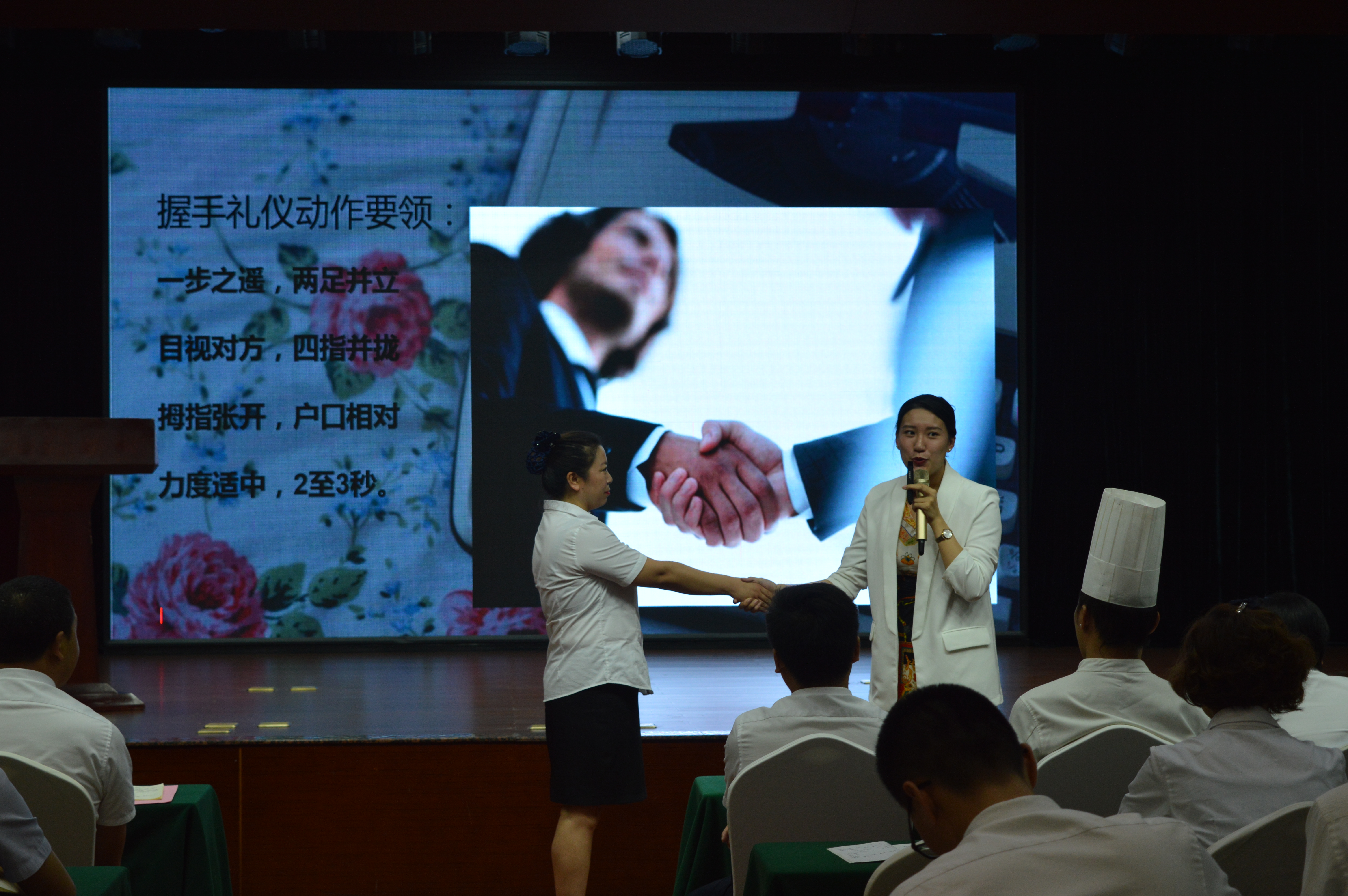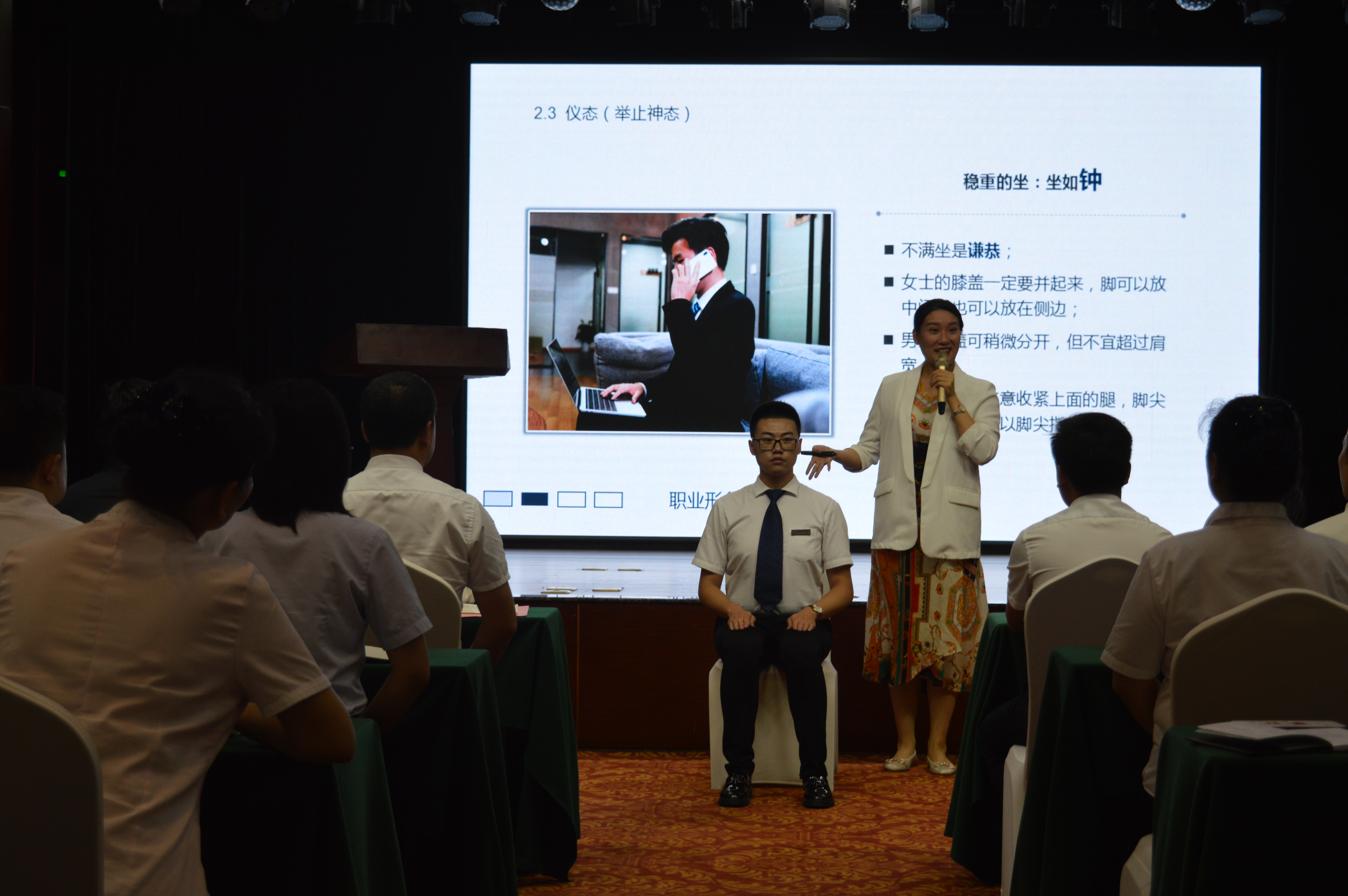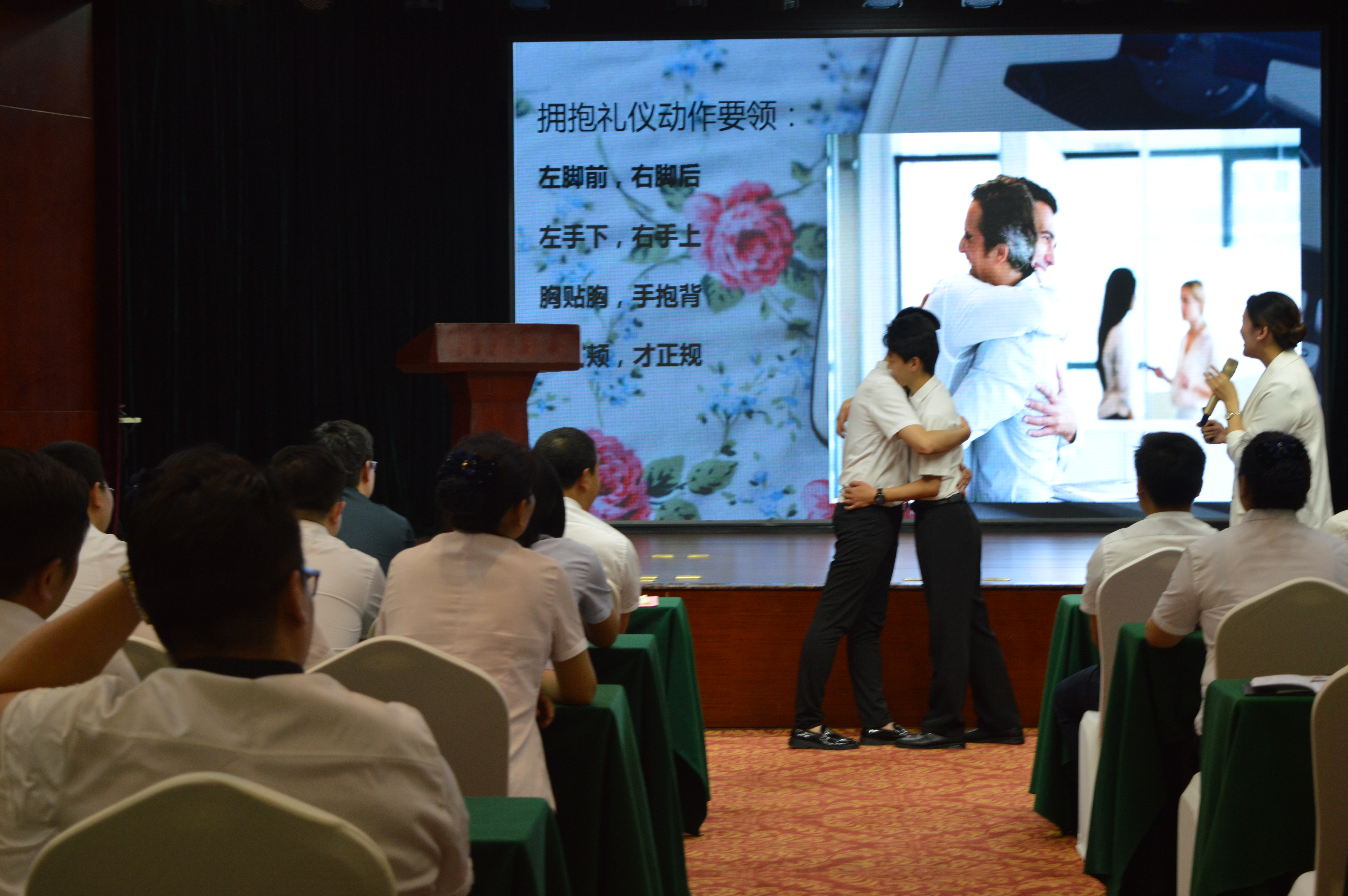 嘉賓曹老師為大家進(jìn)行了精彩而生動的服務(wù)禮儀培訓(xùn),曹老師從日常的儀表、站姿、坐姿、行走、擁抱、握手、鞠躬等禮儀規(guī)范方面,邀請現(xiàn)場員工互動參與并示范講解,另外通過案例與影片分享,闡釋了服務(wù)美學(xué)的重要意義,以及如何從基本的服務(wù)到滿意的服務(wù)再到感動的服務(wù)。現(xiàn)場教學(xué)氛圍活躍,精彩處引發(fā)陣陣掌聲。