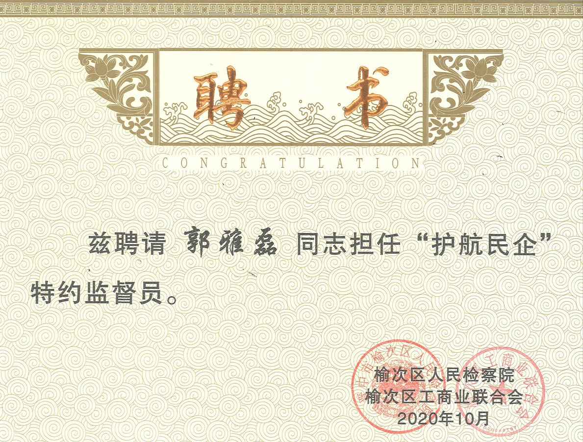 集團(tuán)總裁郭雅磊受聘為“護(hù)航民企”特約監(jiān)督員,耿檢察長(zhǎng)為郭總頒發(fā)聘書(shū)
